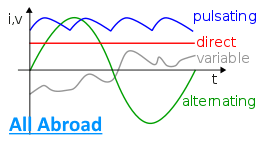 Alternating current (AC) is an electric current which periodically reverses direction, in contrast to direct current (DC) which flows only in one direction. Alternating current is the form in which electric power is delivered to businesses and residences, and it is the form of electrical energy that consumers typically use when they plug kitchen appliances, televisions, fans and electric lamps into a wall socket. A common source of DC power is a battery cell in a flashlight. The abbreviations AC and DC are often used to mean simply alternating and direct, as when they modify current or voltage.